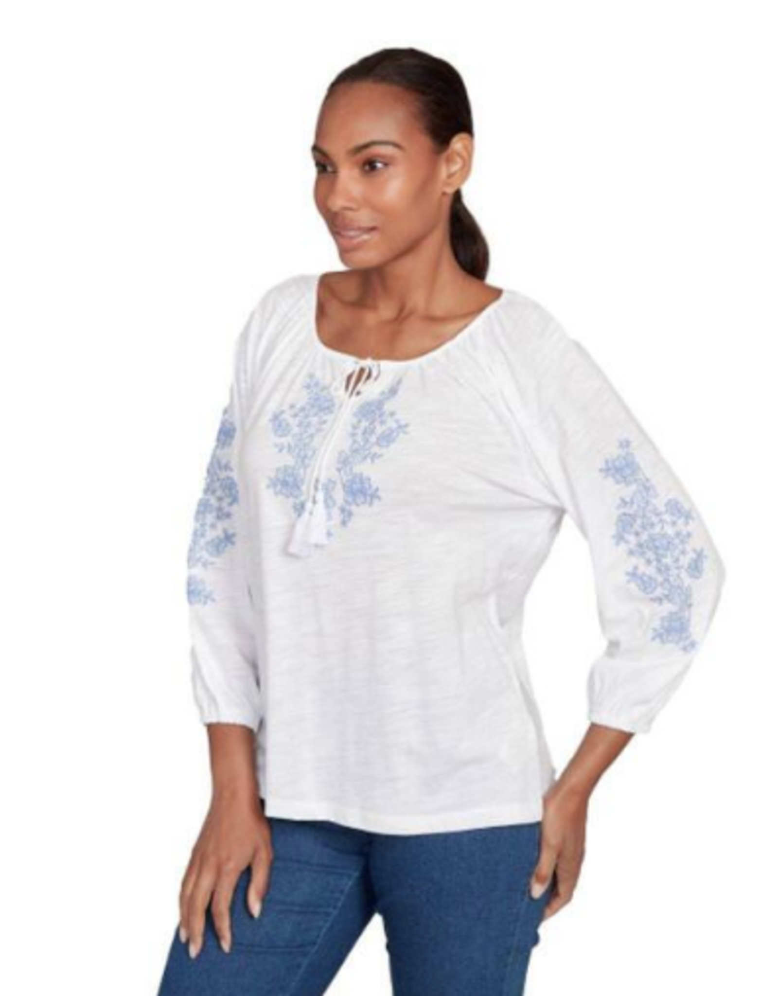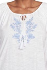 Skyes Petite White/Blue 3/4 Slv Embroidered Peasant Slub Top